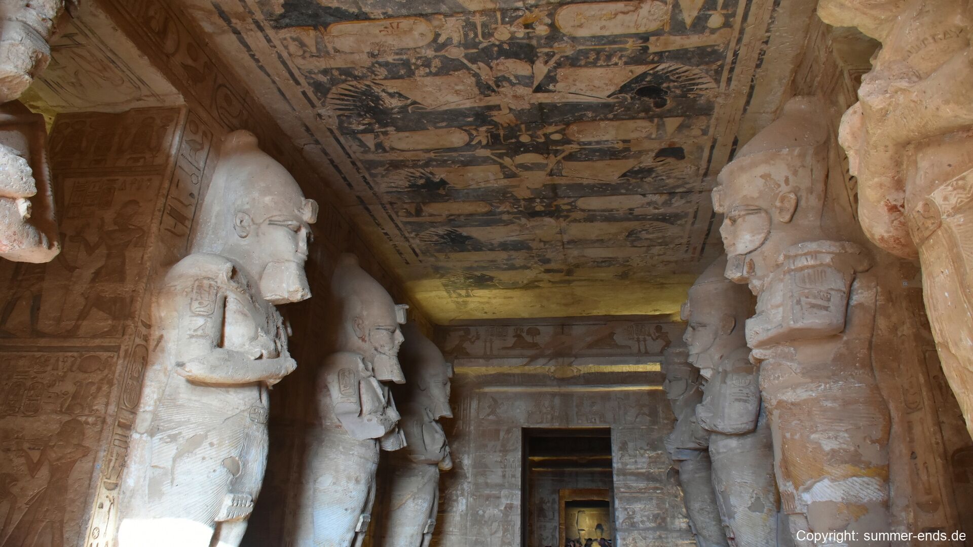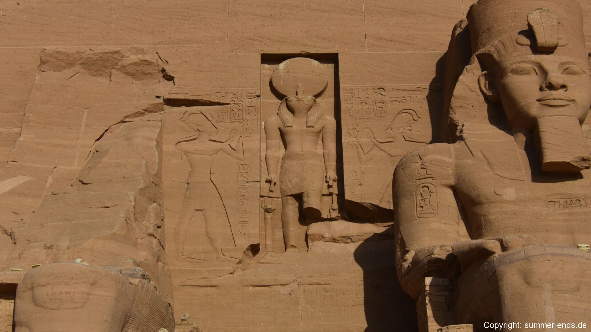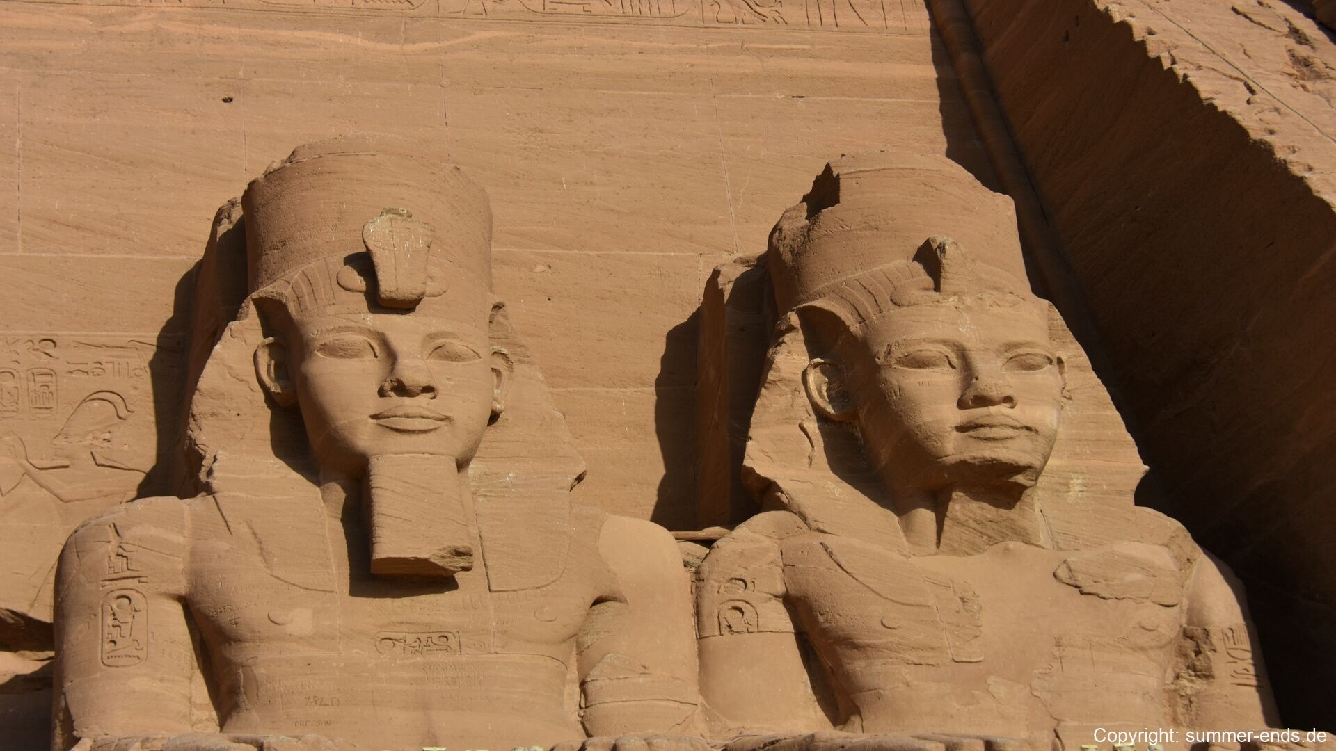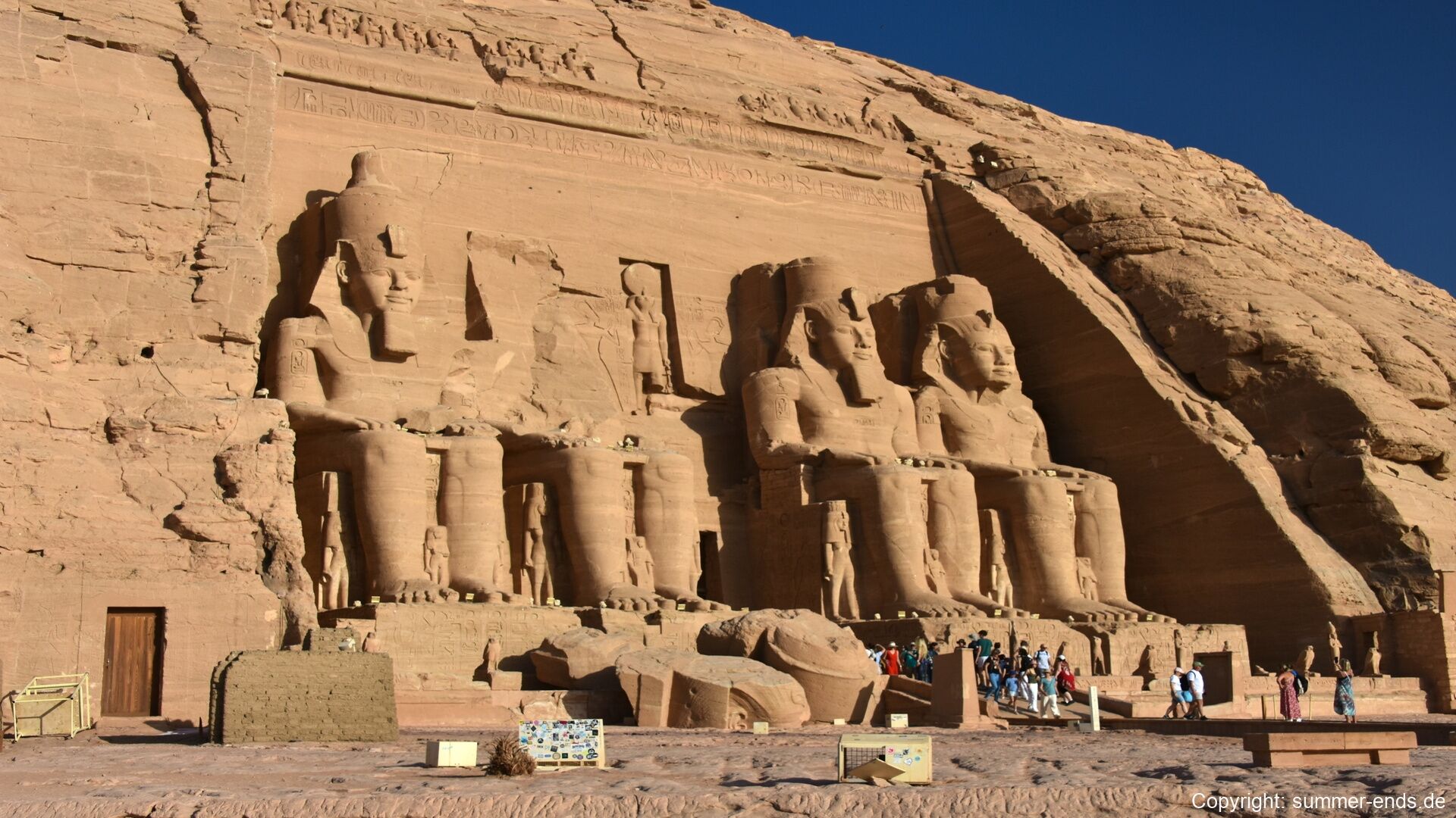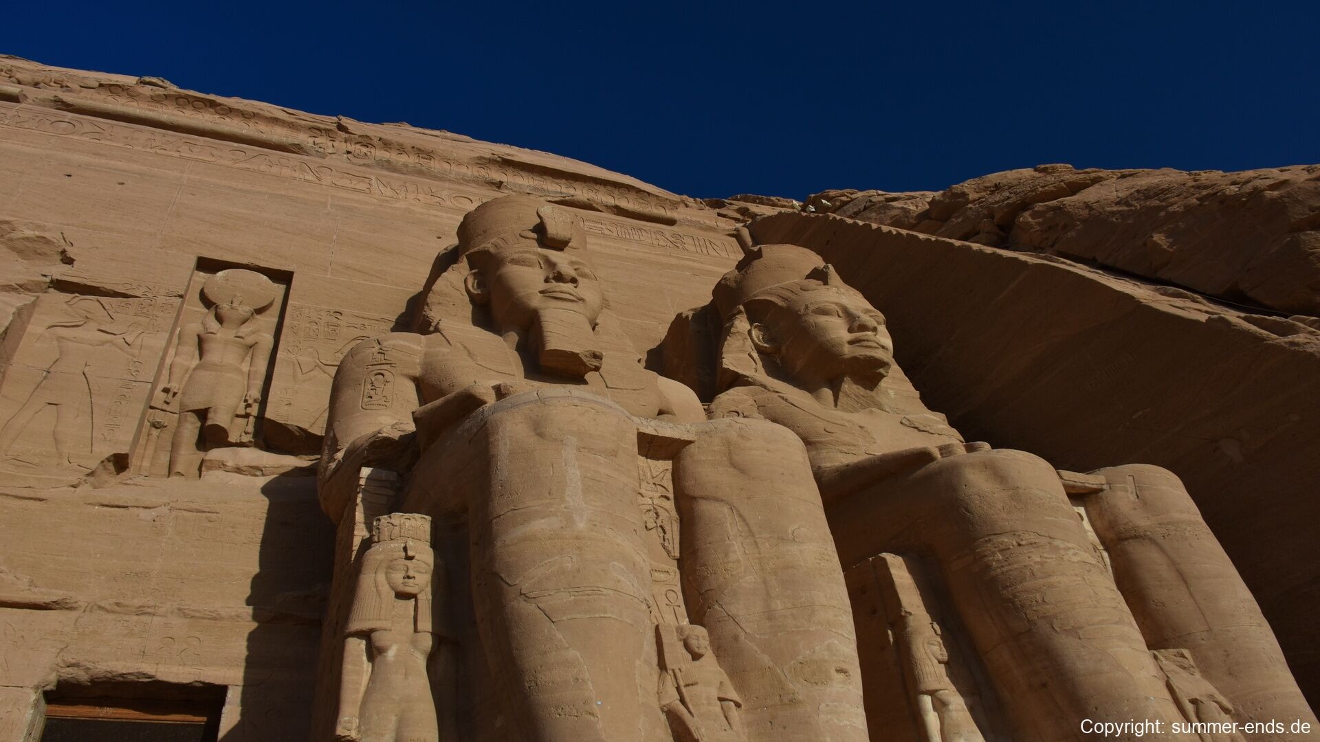 The temples of Abu Simbel were carved directly into a sandstone cliff facing the Nile and are renowned for their colossal statues, intricate interior reliefs, and astronomical alignment. They are dedicated to the gods Amun-Ra, Ra-Horakhty, Ptah, and to Ramses himself, as a deified ruler.