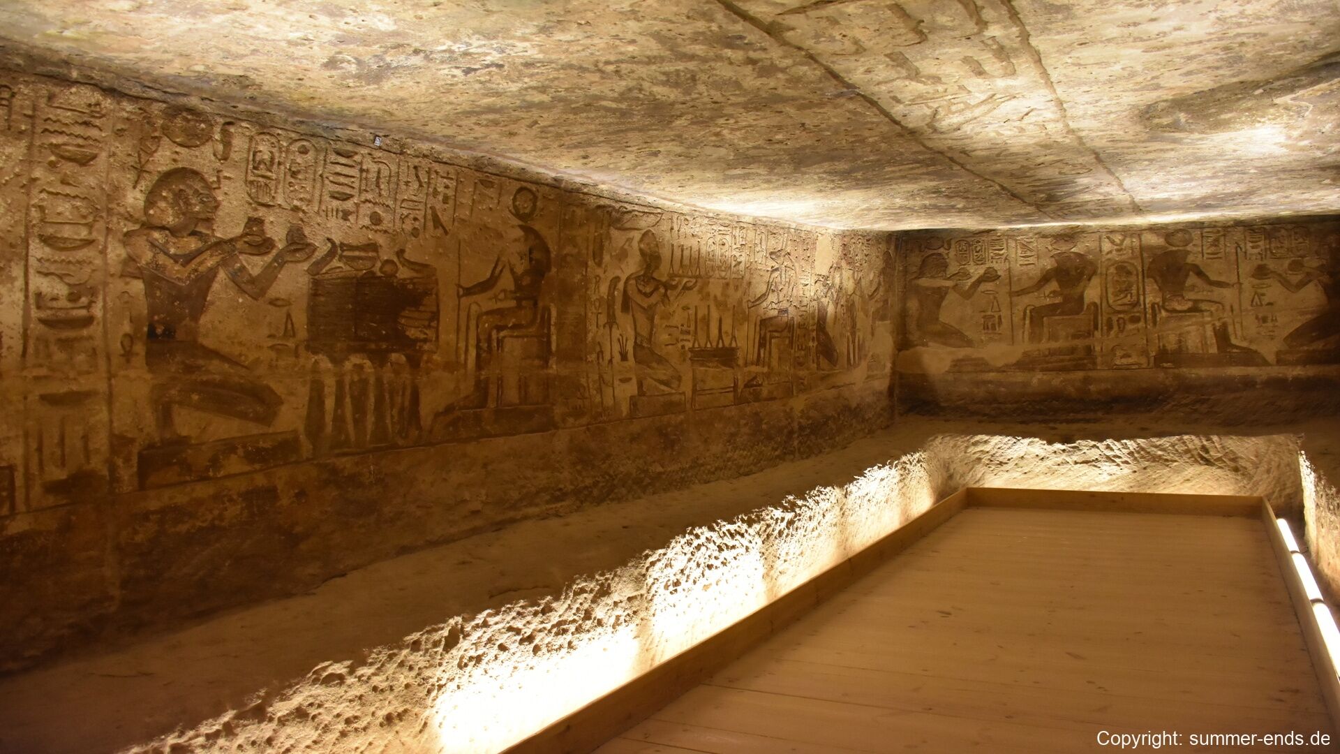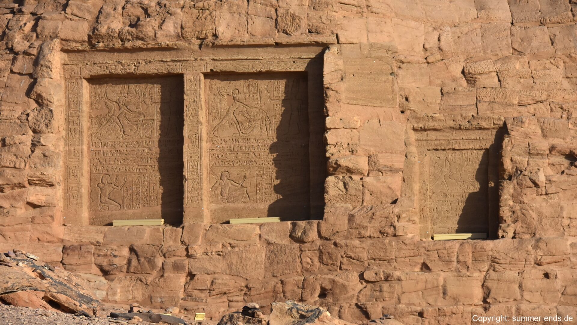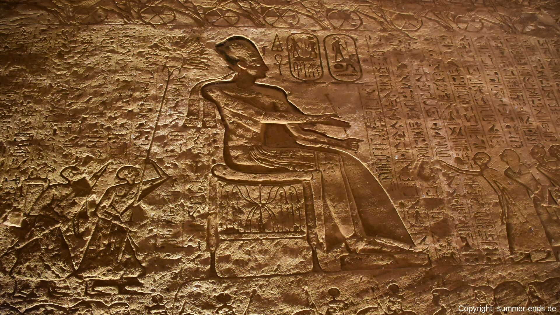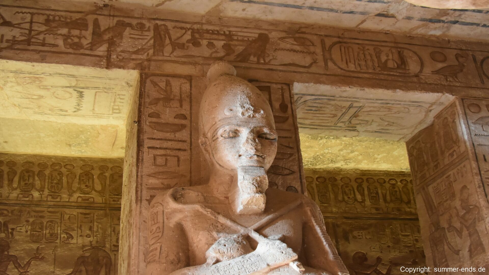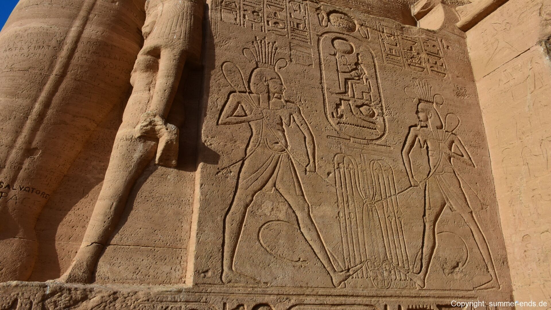 The temples of Abu Simbel were carved directly into a sandstone cliff facing the Nile and are renowned for their colossal statues, intricate interior reliefs, and astronomical alignment. They are dedicated to the gods Amun-Ra, Ra-Horakhty, Ptah, and to Ramses himself, as a deified ruler.