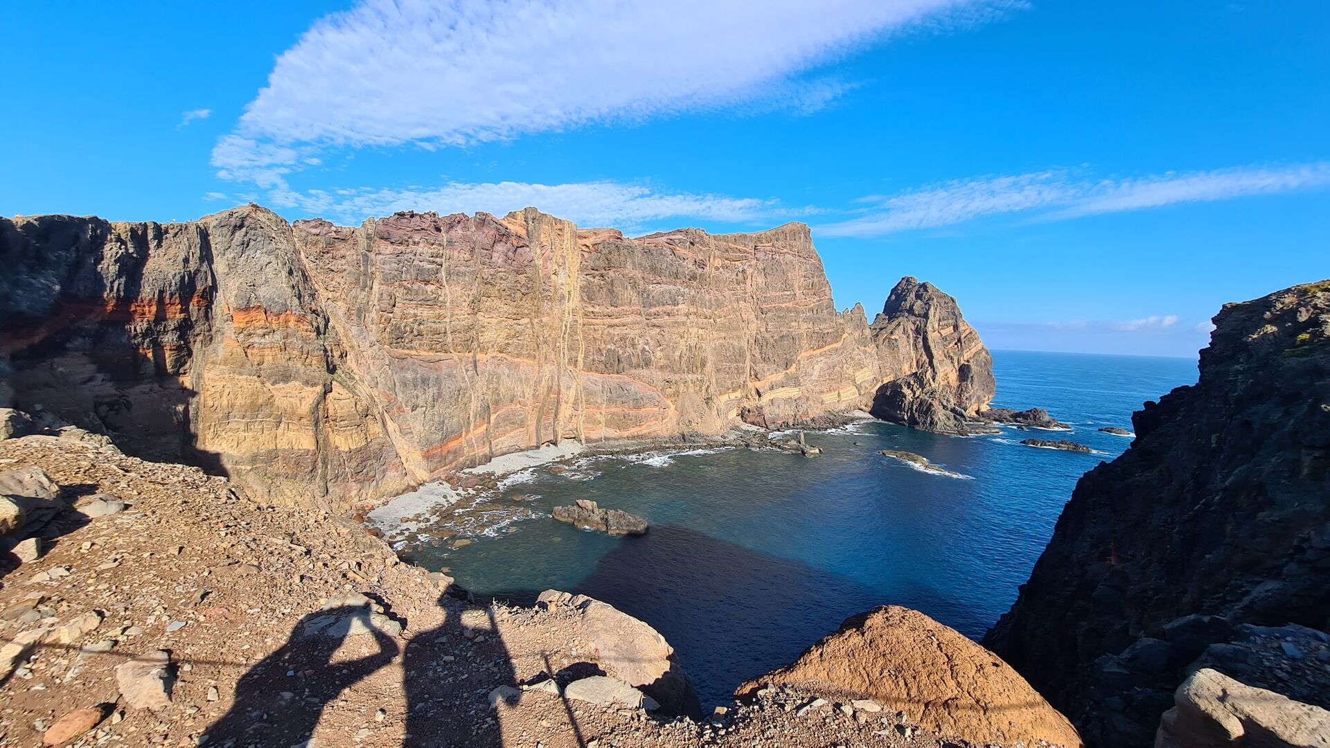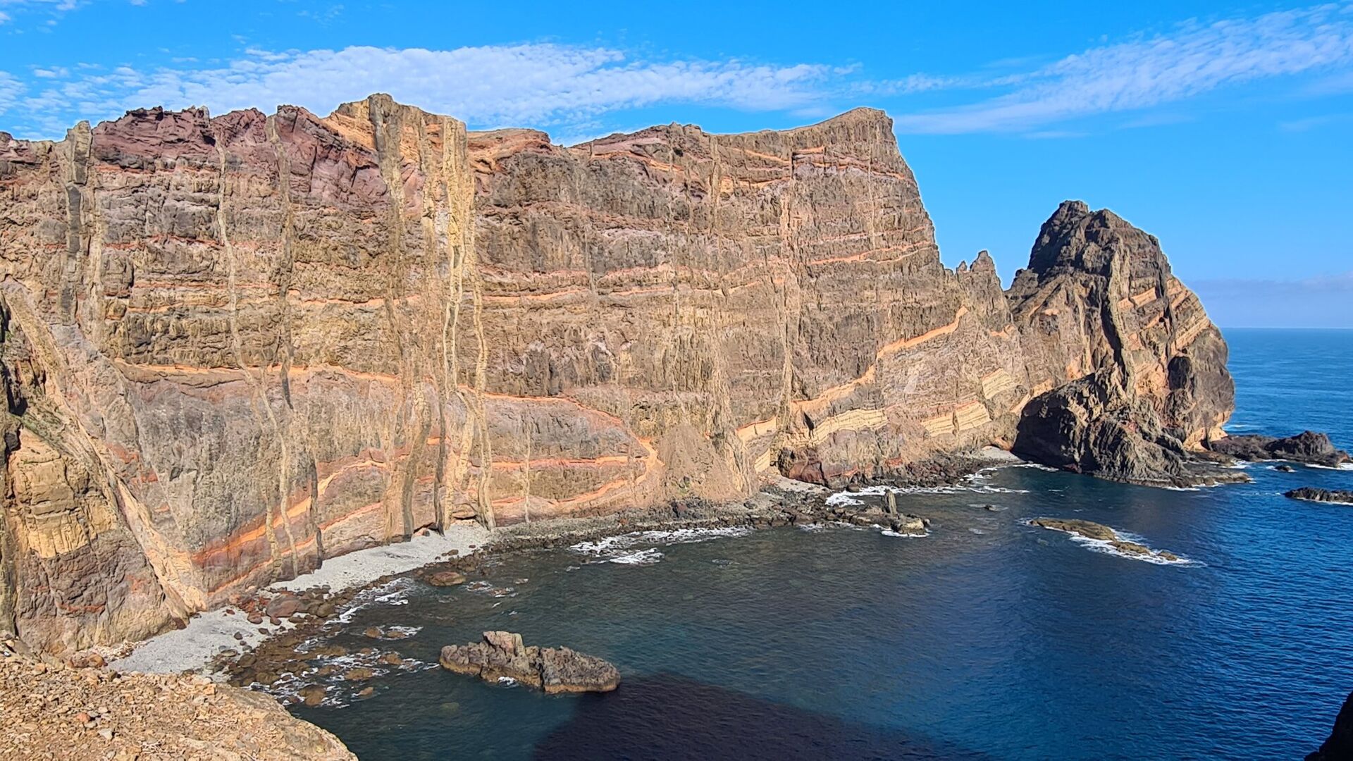 Geologically, the Ponta do Furado region is an integral part of Madeira’s volcanic framework. The coastal cliffs consist predominantly of basaltic rocks formed during successive submarine and subaerial volcanic phases. Exposed lava sequences, layered volcanic deposits, and intrusive structures such as dykes are clearly visible, reflecting former magma pathways within the volcanic edifice.