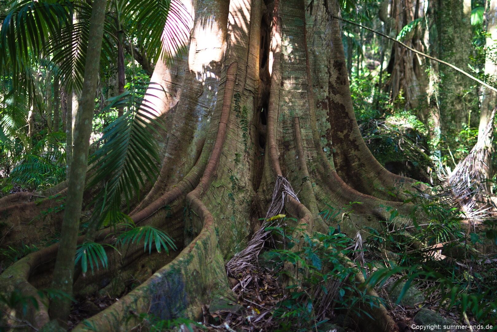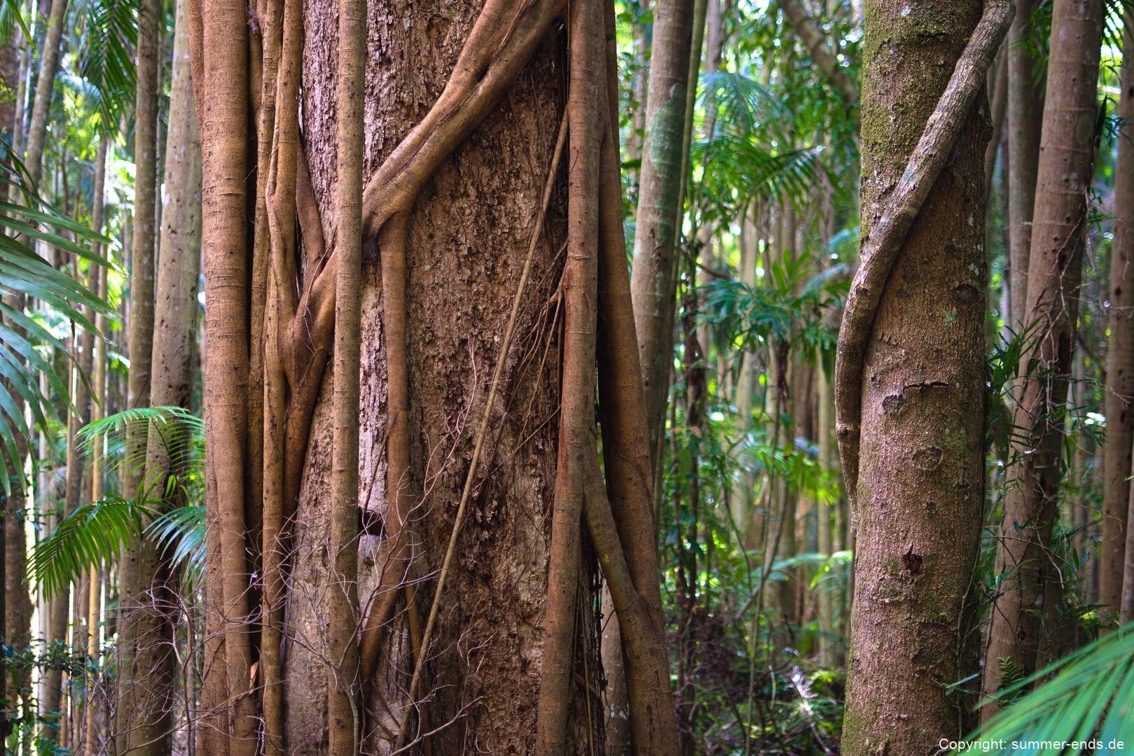 Tamborine National Park contains a range of natural features that reflect its volcanic origin and rainforest environment. Key attractions include Curtis Falls and Cedar Creek Falls, where streams descend over basalt ledges into shaded rainforest gullies. Palm Grove and Joalah sections of the park preserve mature subtropical rainforest with high biodiversity and complex forest structure.