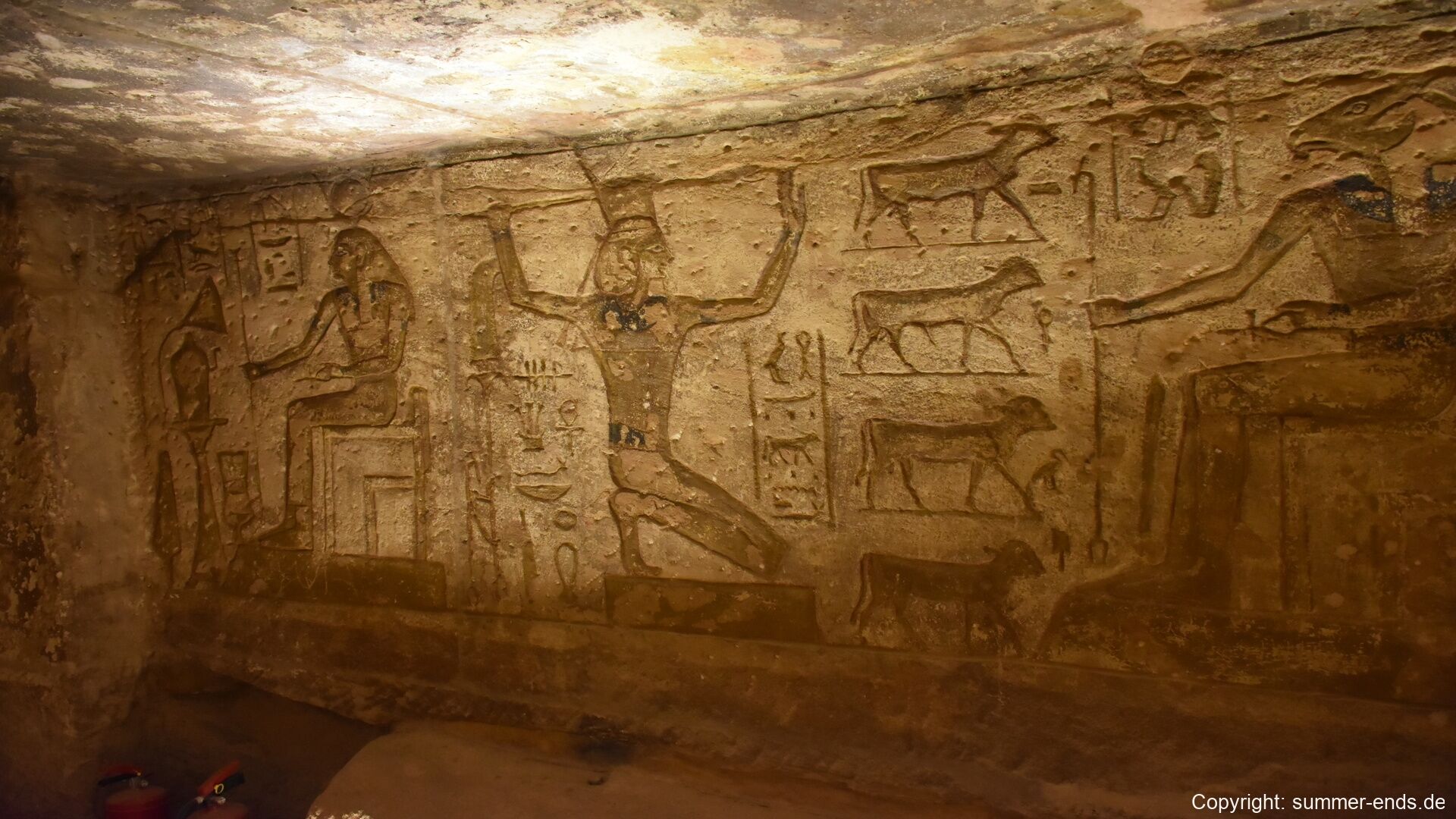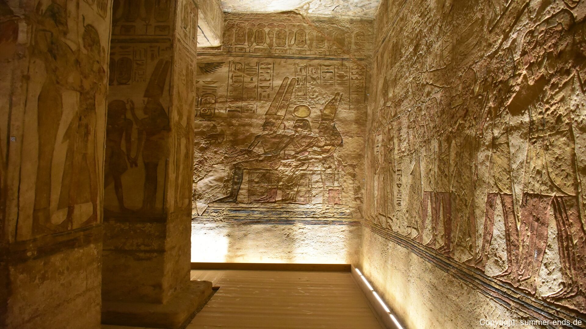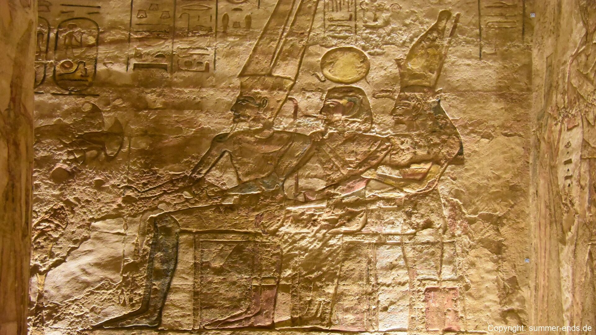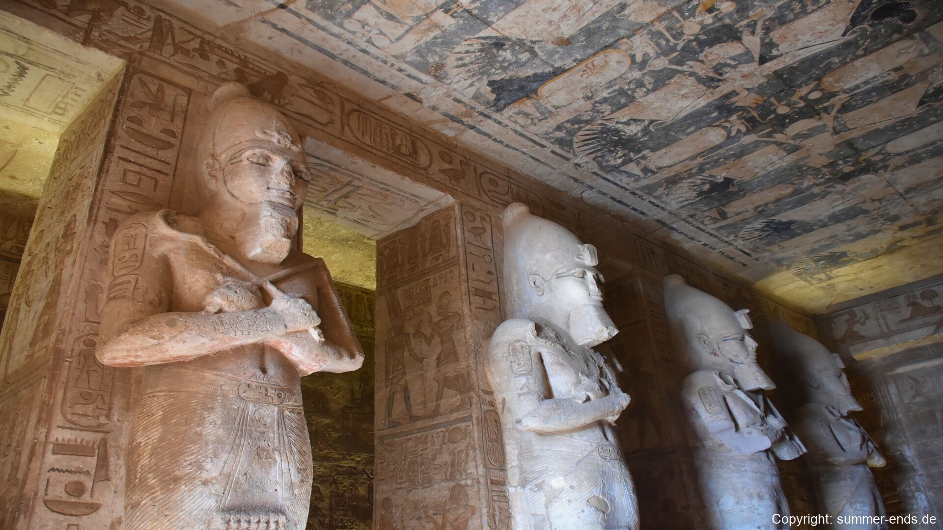 The Small Temple of Nefertari stands nearby and features six standing statues—four of Ramses and two of Nefertari—each about 10 meters tall. Inside, the temple walls display elegant scenes of Nefertari making offerings to Hathor and participating in rituals as both queen and goddess. The interior is more intimate but equally refined, with vibrant carvings and symbolic artwork.