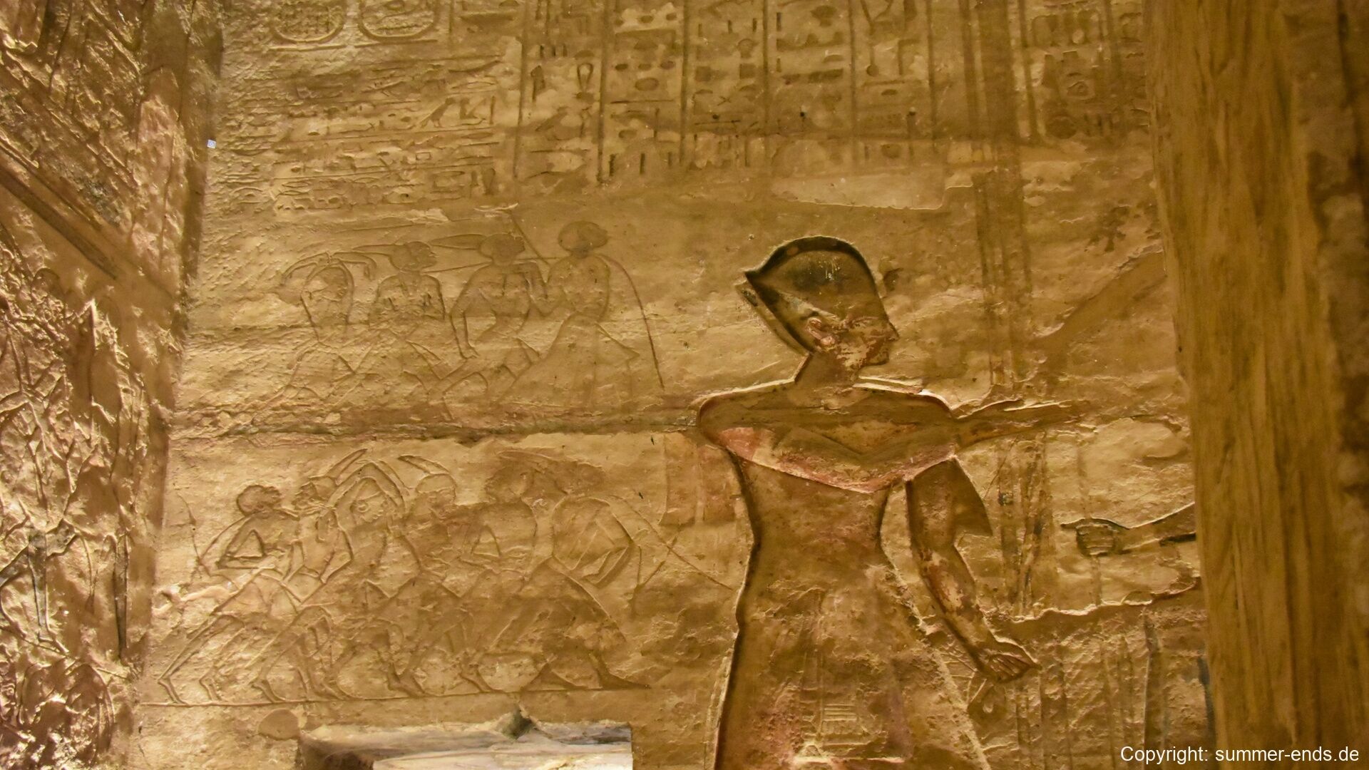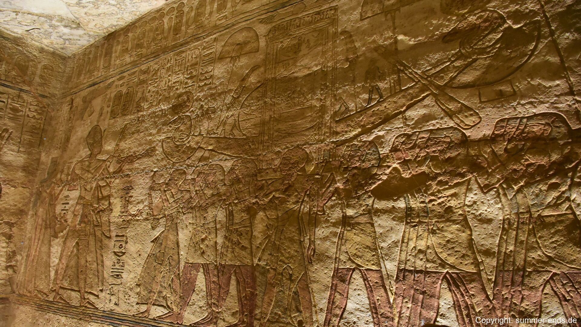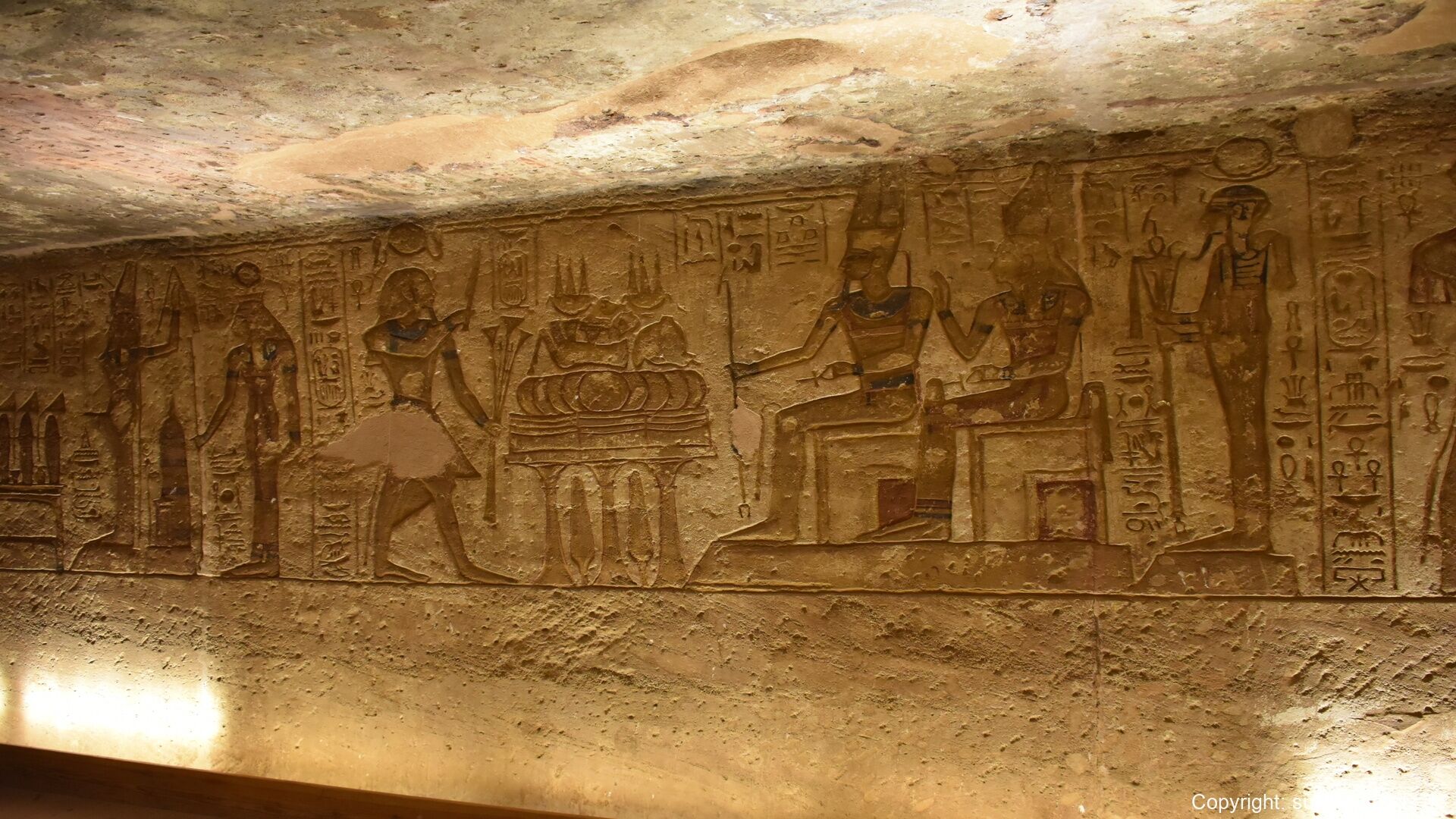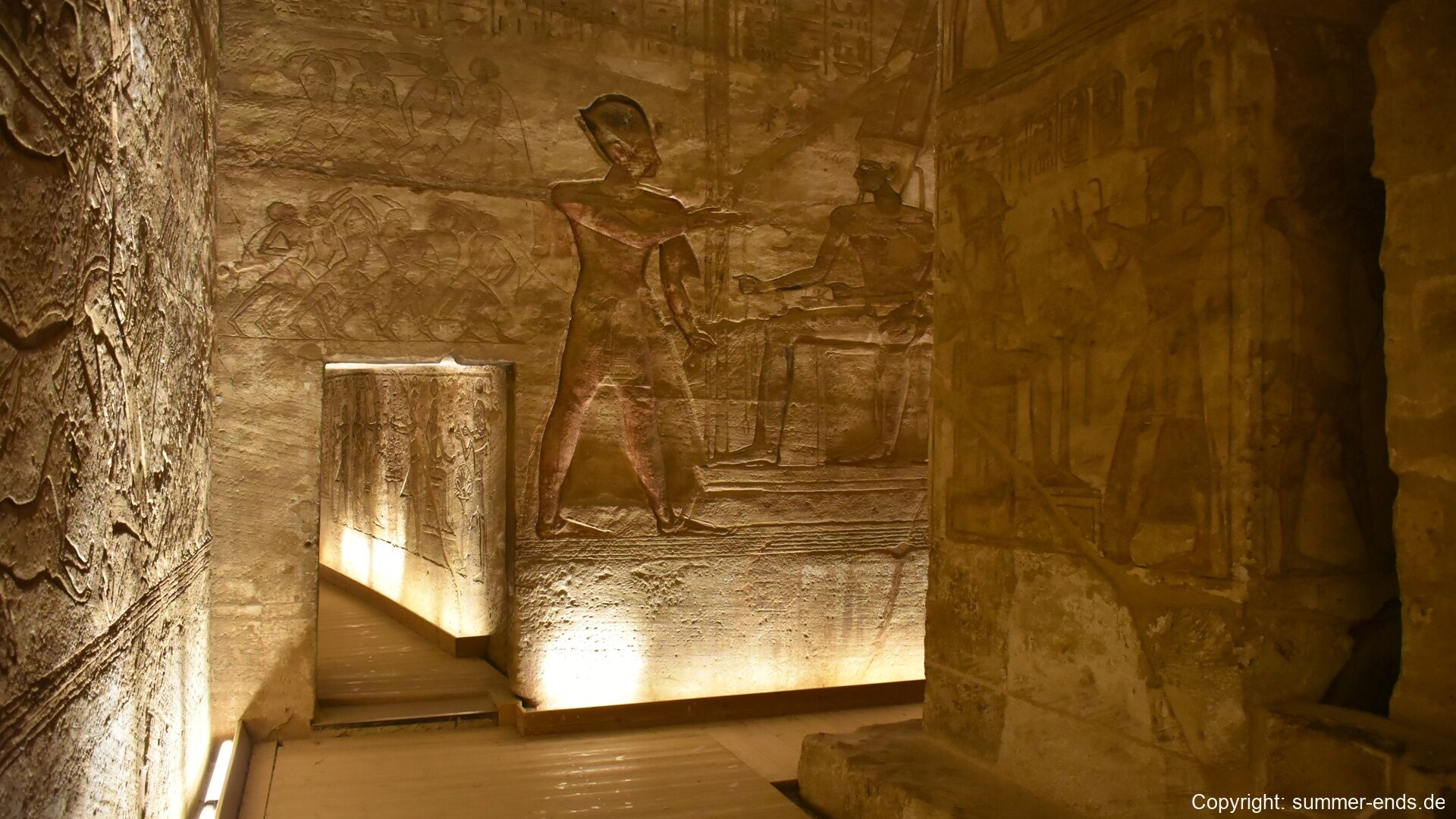 The Great Temple of Ramses II is dominated by four colossal seated statues of the pharaoh, each about 20 meters tall, flanking the entrance. Inside, a hypostyle hall leads to a series of chambers adorned with reliefs depicting battle scenes, such as the famous Battle of Kadesh, as well as offerings to gods and images of Ramses in divine form. At the innermost sanctuary, statues of Amun-Ra, Ra-Horakhty, Ptah, and Ramses himself are aligned so that twice a year—on February 22 and October 22—the sun’s rays penetrate the temple and illuminate the figures, a phenomenon likely planned to coincide with Ramses’ coronation and birthday.