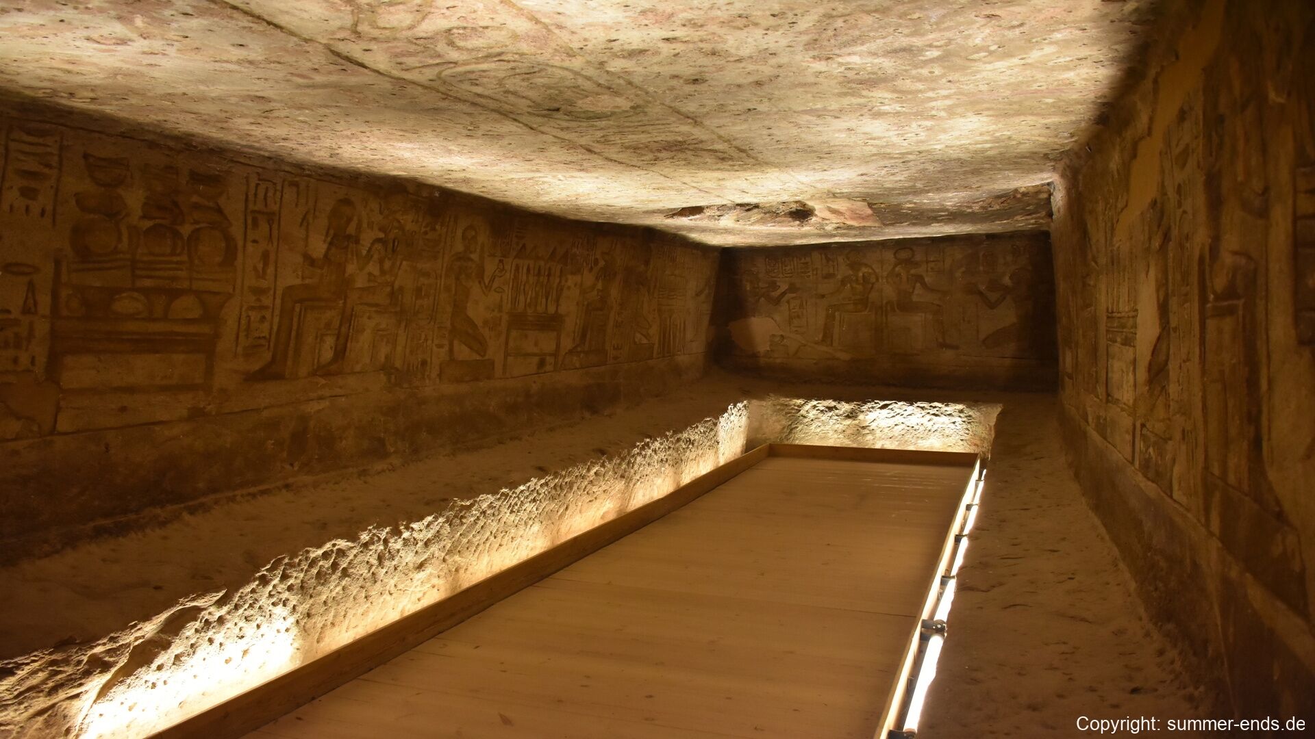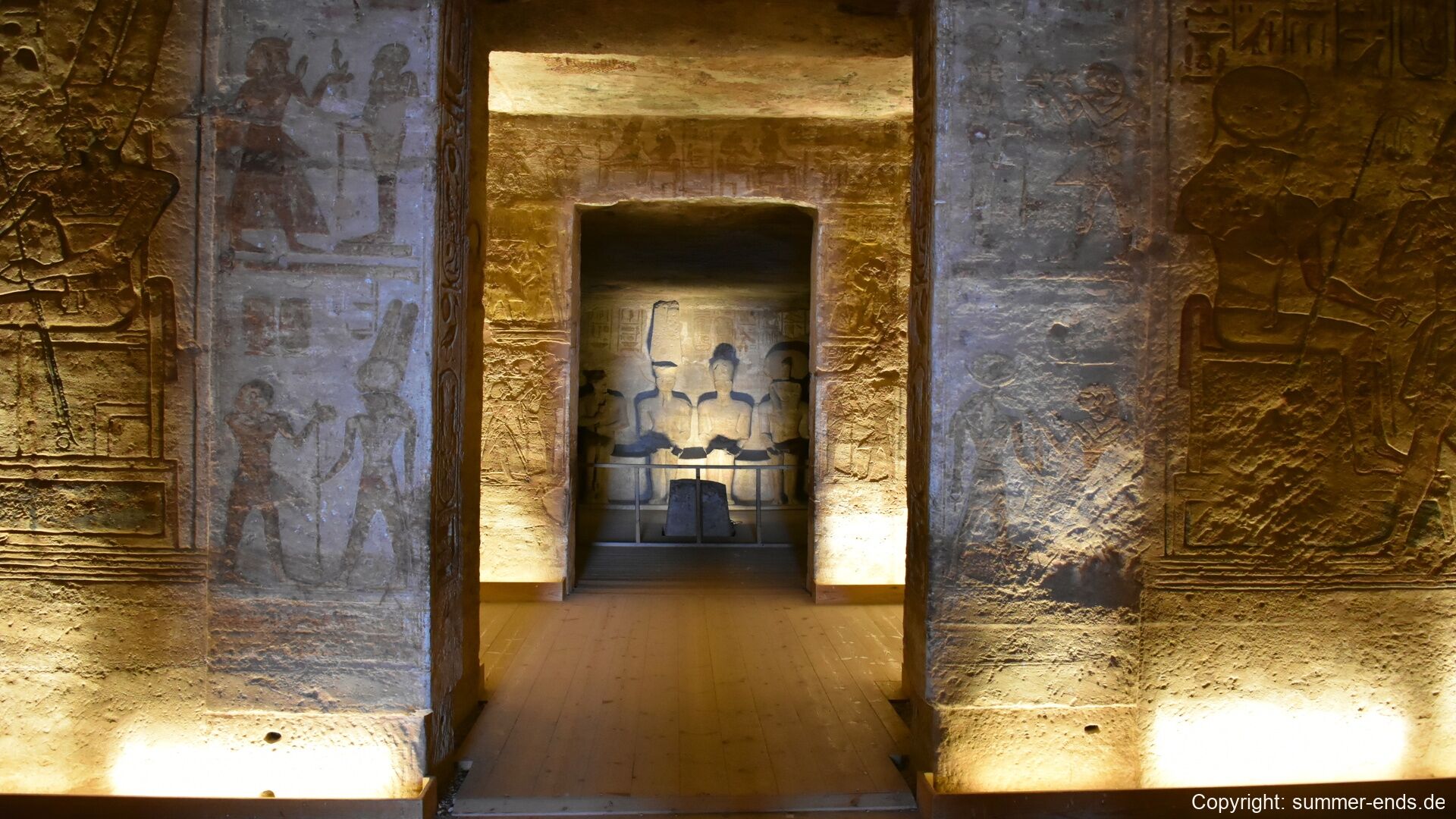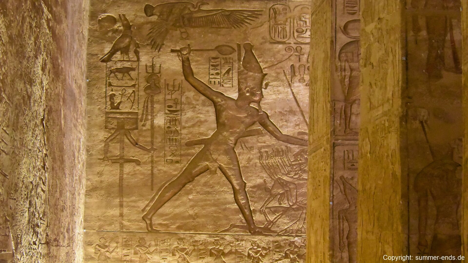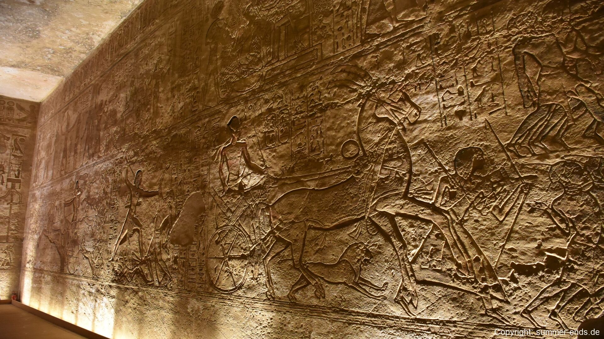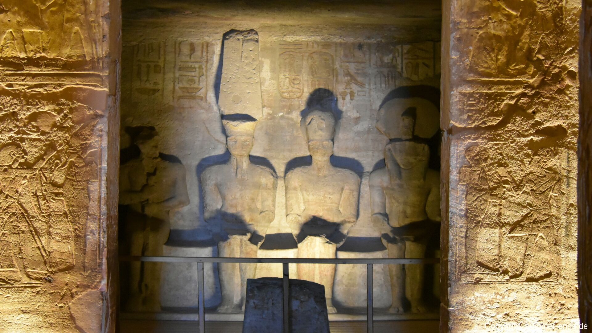 The Great Temple of Ramses II is dominated by four colossal seated statues of the pharaoh, each about 20 meters tall, flanking the entrance. Inside, a hypostyle hall leads to a series of chambers adorned with reliefs depicting battle scenes, such as the famous Battle of Kadesh, as well as offerings to gods and images of Ramses in divine form. At the innermost sanctuary, statues of Amun-Ra, Ra-Horakhty, Ptah, and Ramses himself are aligned so that twice a year—on February 22 and October 22—the sun’s rays penetrate the temple and illuminate the figures, a phenomenon likely planned to coincide with Ramses’ coronation and birthday.