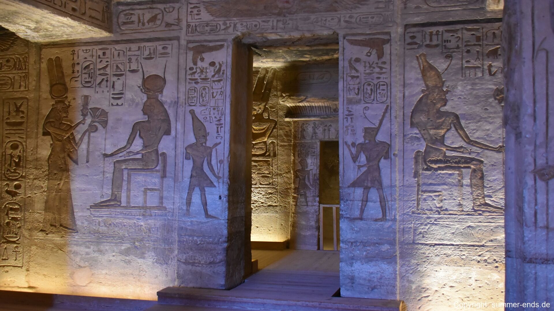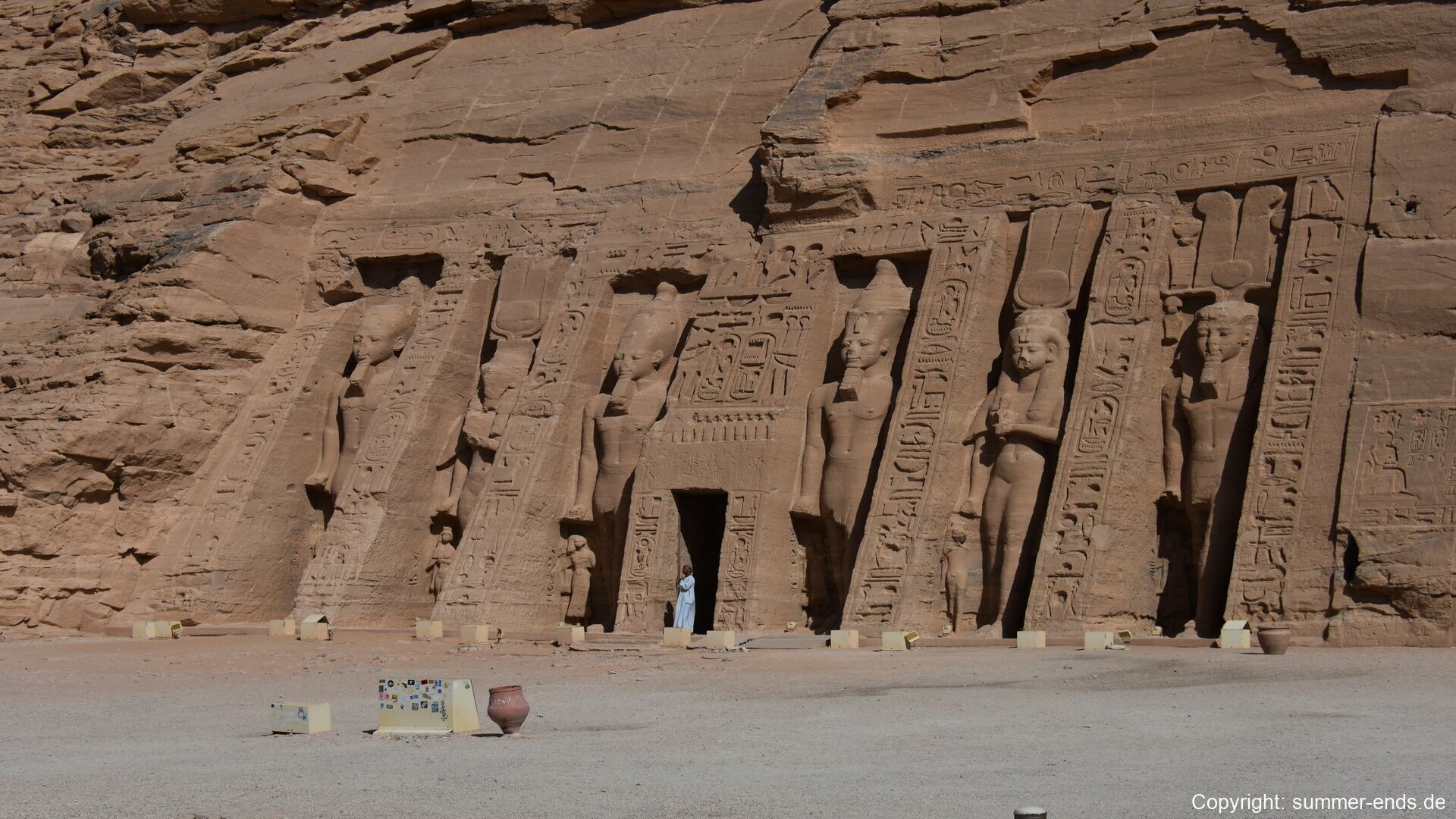 The Small Temple of Nefertari stands nearby and features six standing statues—four of Ramses and two of Nefertari—each about 10 meters tall. Inside, the temple walls display elegant scenes of Nefertari making offerings to Hathor and participating in rituals as both queen and goddess. The interior is more intimate but equally refined, with vibrant carvings and symbolic artwork.