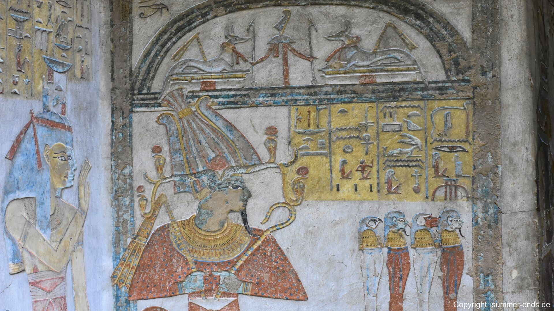 In the Valley of the Queens, the most significant site is the tomb of Nefertari (QV66), often described as the most beautiful tomb in Egypt. Its walls are painted with full-color images of the queen interacting with gods such as Isis and Hathor, and the ceiling depicts a starry sky. Due to the tomb’s fragility, access is restricted and requires a special ticket.
